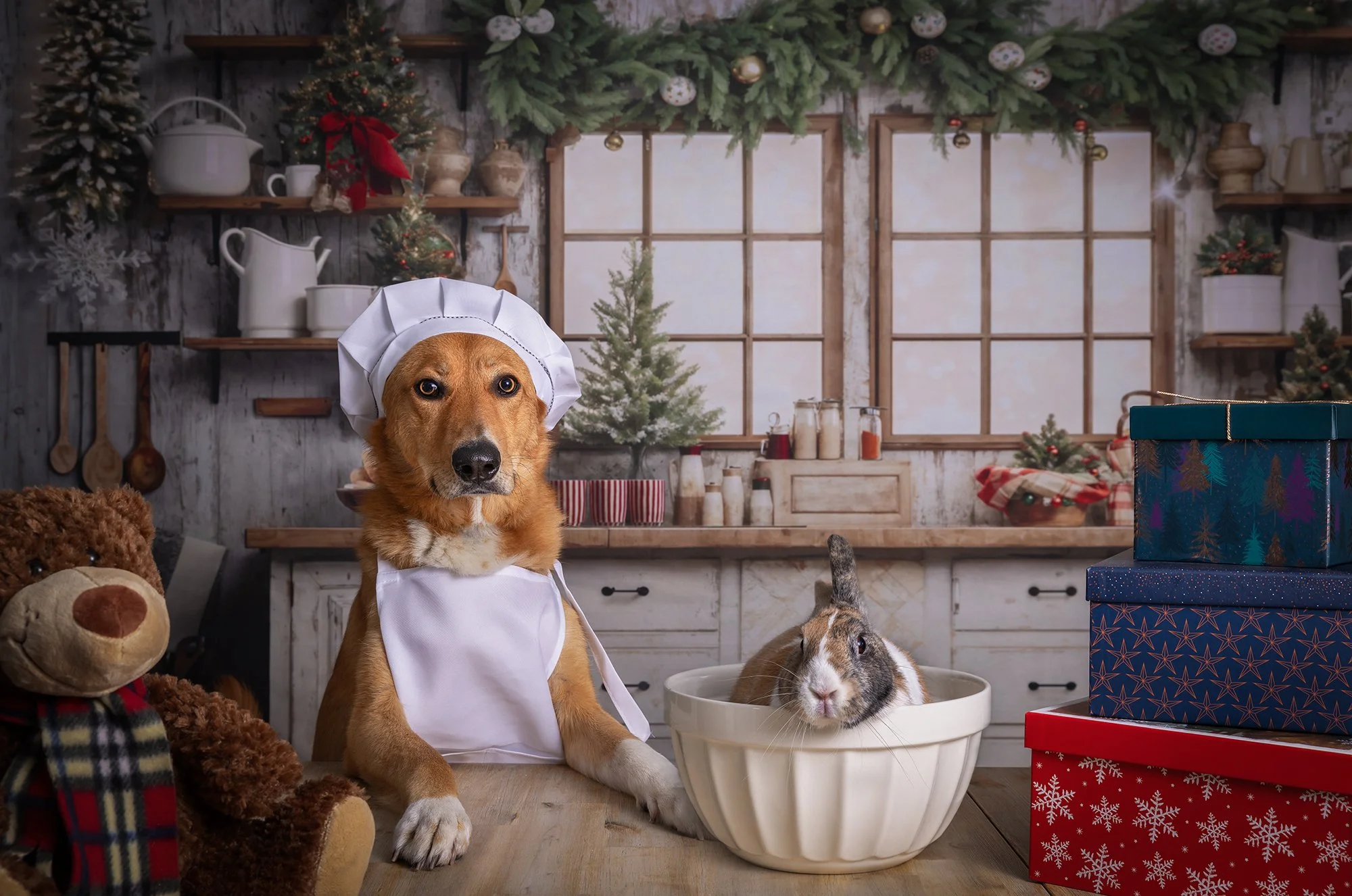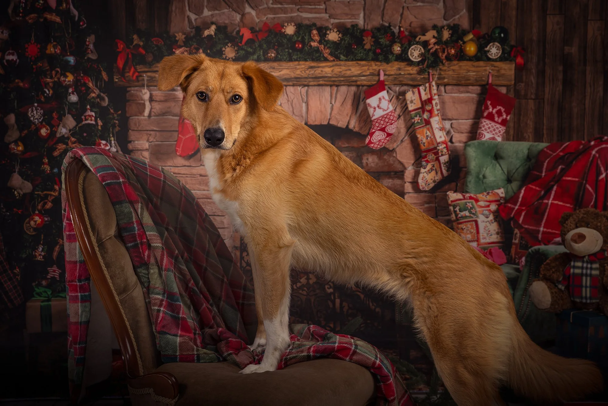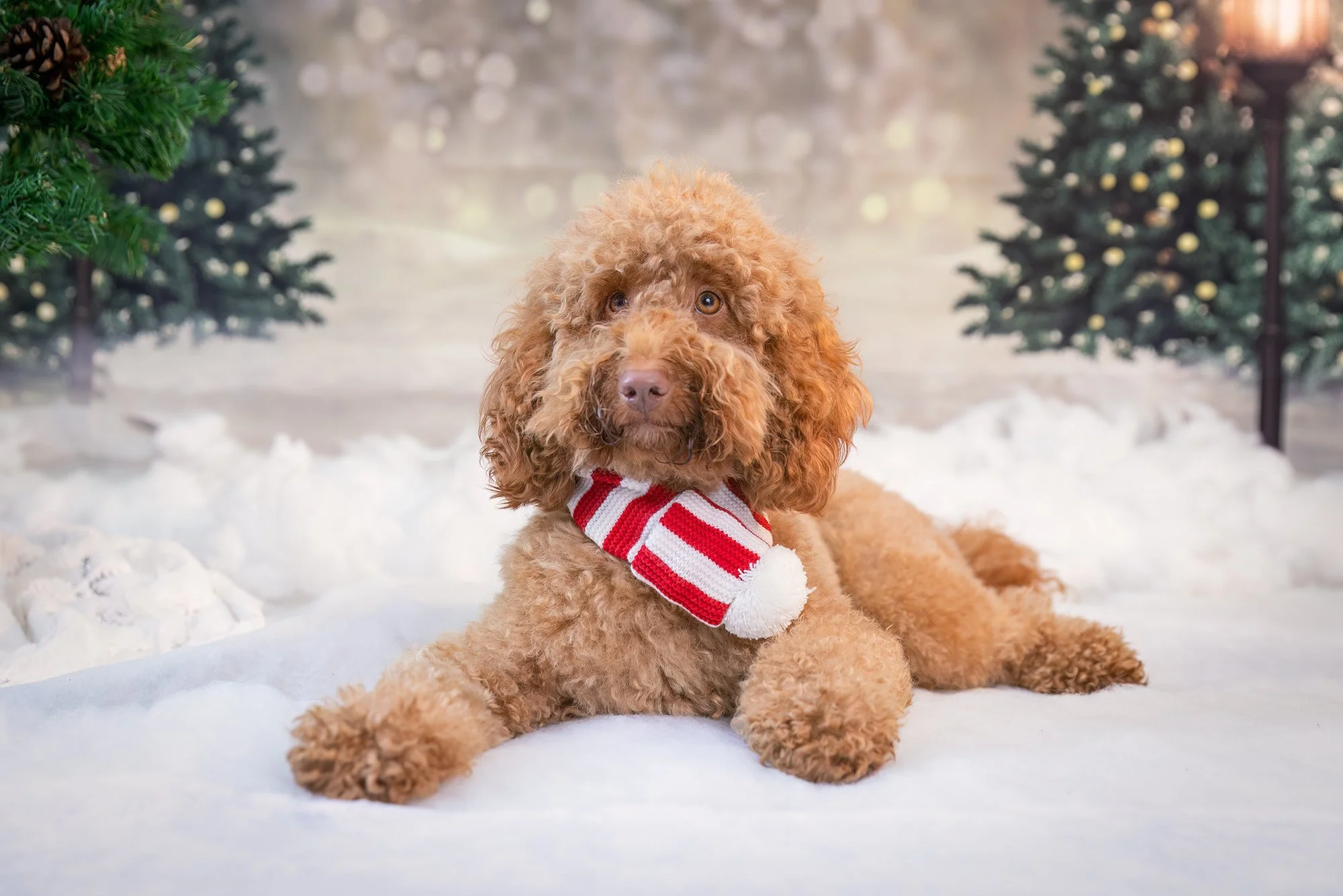 The are 30-minute long sessions for dogs on a Christmas-themed setup (backdrop and props). They take place in a studio environment (indoors, using professional studio lighting). Dogs must be able to sit and wait on command.